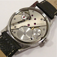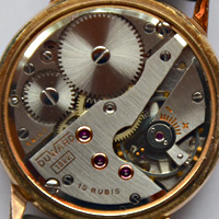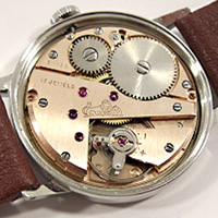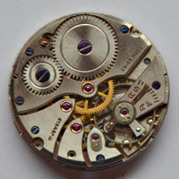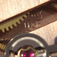 | 17 Steine, vergoldete Scheinchatons, ohne Stoßsicherung, nachträglich gebläute Schrauben | noch unrestauriert: frühes Werk mit 15 Steinen, Scheinchatons, ohne Stoßsicherung, Metalllager für Minutenrad | ||