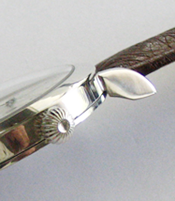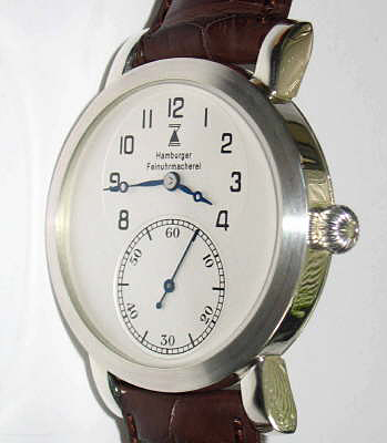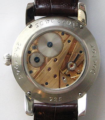 auf dezentrale Anzeige umgerüstet 17 Steine, Incabloc stossgesichert, handgebläute Schrauben, Zifferblatt aus massivem 925/000 Sterlingsilber, Breguet Stahlzeiger gebläut Gehäuse: zweiteilig, massiv 925/000 Sterlingsilber, poliert und rhodiniert, Lünette matt mit geschraubtem Glasboden, 6 mm Kugelkrone Bandanstoss: 20mm Armband:echt Louisiana Aligator Dornschliesse: massiv 925/000 Sterlingsilber