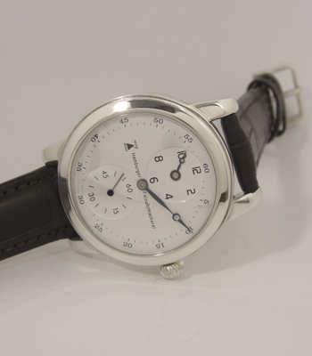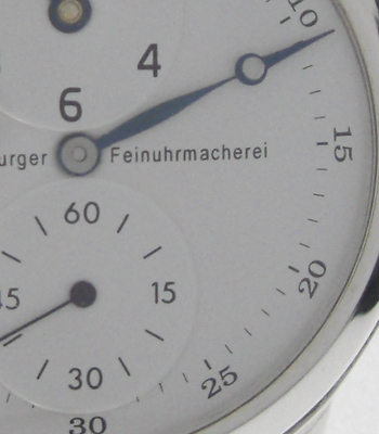 Regulator Handarbeit AS 1130, Incabloc stossgesichert, 17 Steine, Handaufzug Werk auf Regulatoranzeige umgerüstet Brücken und Kloben handgraviert Werkschrauben poliert und handgebläut Zifferblatt 925/000 Sterlingsilber, weiss Emailelack polierte und gebläute Breguet Stahlzeiger zweiteiliges, poliertes, massives 925/000 Sterlingsilbergehäuse geschraubter Boden mit Glaseinsatz beidseitig Saphirgläser Bandanstoss: 18mm braunes Louisiana Alligator Armband Dornschliesse massiv 925/000 Sterlingsilber
